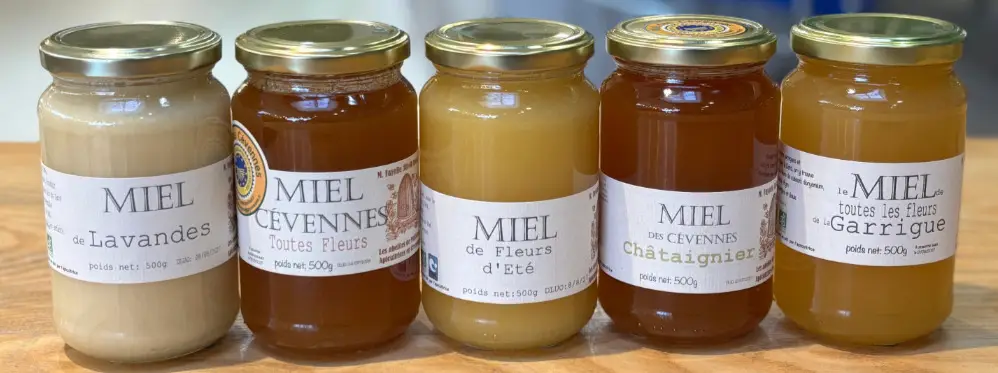 ainsi que dans certains points de vente partenaires, tels que Biocoop l'Aile du Papillon au Crès. Ils proposent une variété de miels, en fonction des fleurs butinées par les abeilles : miel de lavande, miel de fleurs sauvages, miel d'acacia.